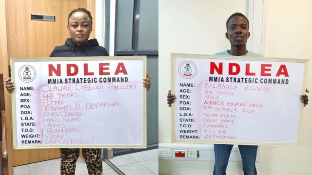 Another suspect, 48-year-old Olawale Oyebola Hakeemot, a UK-based Public Health Assistant, was arrested on October 12, 2025, at Terminal 2 of the Murtala Muhammed International Airport, Ikeja. NDLEA officers discovered 2,300 tramadol pills (225mg) concealed inside frozen snails in her luggage while she was preparing to board a Qatar Airways flight to Manchester, UK.